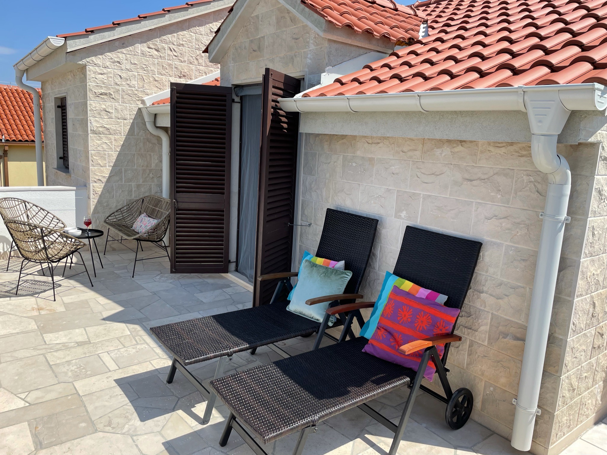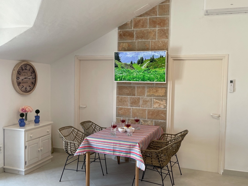 Das voll klimatisierte Apartment Julia befindet sich im Obergeschoß des Hauses und ist leicht über die Außentreppe zu erreichen. Es verfügt über eine gradiose Aussicht auf die Blaue Adria, den Poolbereich und die umliegenden Natur von der großzügigen Terrasse. Durch die besondere Lage des Hauses bietet die Terrasse den ganzen Tag über Sonne sowie schattige Bereiche und Privatsphäre an. Ihr könnt sowohl den Sonnenaufgang als auch den Sonnenuntergang genießen. Das nächtliche Lichterspiel von Split bis Omis auf dem Festland wie auch deren Skyline könnt ihr die ganze Nacht genießen.