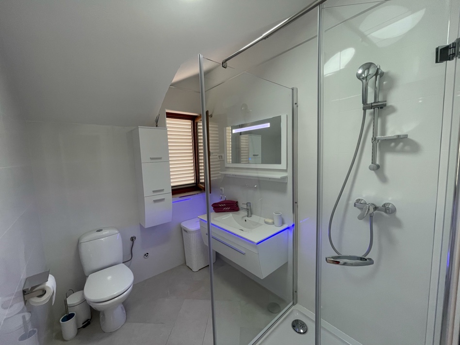 Das geräumige Badezimmer verfügt über eine Dusche, ein Waschbecken mit Schränken sowie über eine Toilette. Hier findet ihr genug Platz für alle Utensilien.