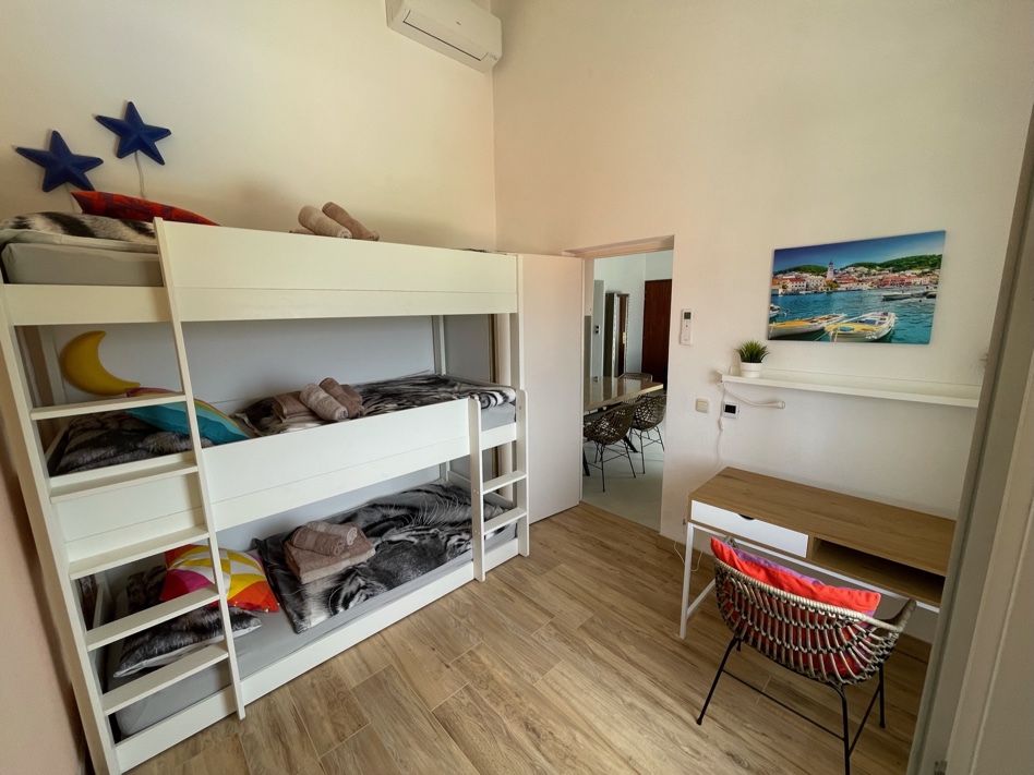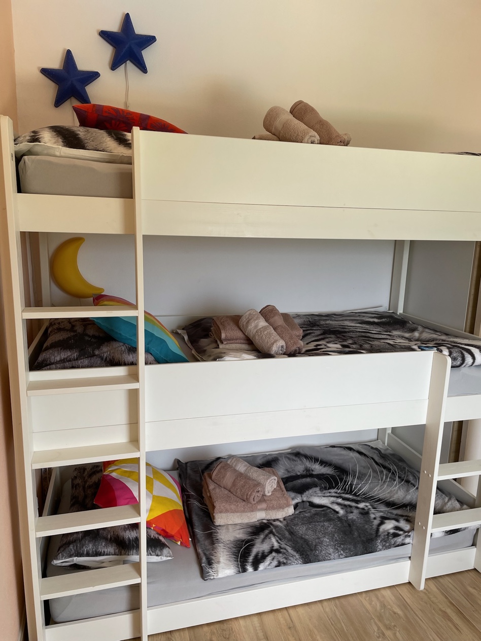 Das Kinderzimmer wurde rundum erneuert mit eigener Klimaanlage und verfügt über bis zu 3 Schlafgelegenheiten: ein Etagenbett á 90x200cm mit 3 Schlafgelegenheiten übereinander.